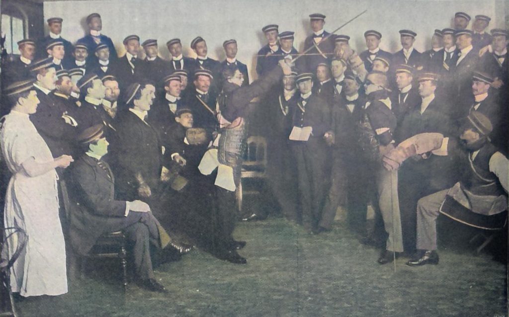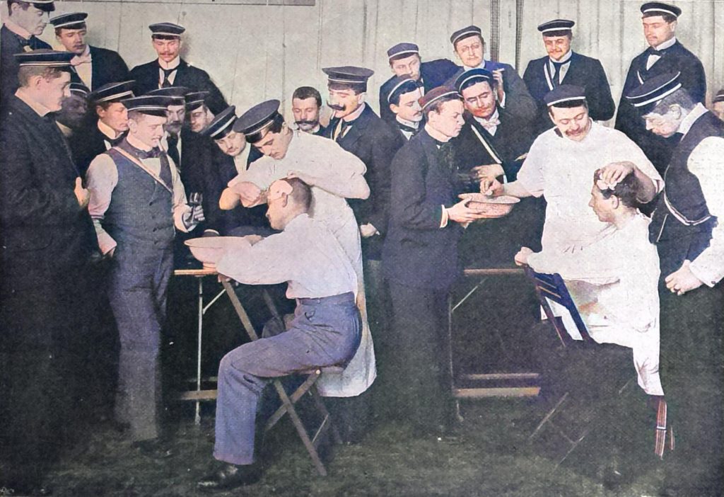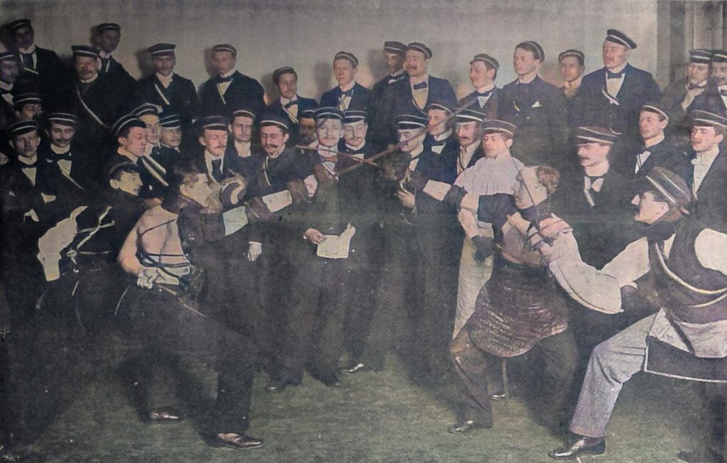 Ist die „Mensur ex“, so treten die Paukärzte mit Nadeln und Verbandzeug in Funktion, um „zu nähen“, die Risse in Haut und Fleisch wieder zusammenzuflicken, wie unser letztes Bild zeigt. Die häufigsten Mensuren sind die der Verbindungsstudenten, und da diese in der Regel auf Bestimmung“ (der beiden Fechtwarte) stattfinden, sind sie nicht allzu gefährlich. Nur wenige Minuten nach beendeter Paukerei sitzt häufig genug die ganze Gesellschaft einschließlich der Verwundeten in der Kneipe beisammen, um den tapferen Kämpfern die „Blume“ zuzutrinken.