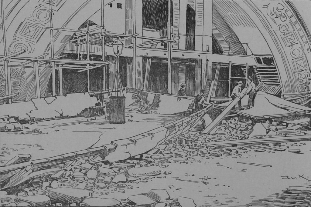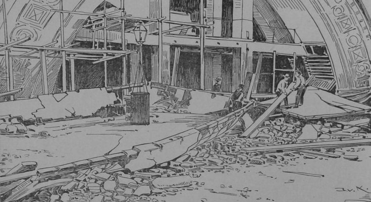 Die Härte des Betons ist ganz außerordentlich und nimmt im Wasser noch zu. Zu Wasserbauten, zu Fundamentierungen, auch für Festungsbauten wurde Beton schon seit längerer Zeit verwandt. Neu ist die Idee, Beton für Bogen mit größerer Spannung, ja sogar für Galerien und Balkone ohne einen zweiten Stützpunkt zu verwenden. Wenn man nun in die Betonmasse entweder eiserne Balken oder auch nur ein eisernes Netz einfügt, kann man es auch für die weitesten Spannungen, die kühnsten Wölbungen gebrauchen, und es übertrifft an Widerstandskraft und Tragfähigkeit sogar die Eisenkonstruktionen von derselben Ausdehnung. Was hat nun das Unglück eigentlich verursacht? – Jedes Bauwerk aus Beton braucht eine gewisse Zeit, um zu erhärten, und in dieser Zeit muß es durch starke Gerüstbauten gestützt werden, bis es erst selbst die Fähigkeit erlangt hat, Lasten zu tragen. Bei der Ueberhastung, mit der jetzt die Ausstellungsbauten fertiggestellt werden, erscheint es wahrscheinlich, daß diese Gerüste viel zu früh entfernt wurden, daß die eigentliche Baumasse noch lange nicht die nötige Festigkeit erreicht hatte, um sich selbst zu stützen.