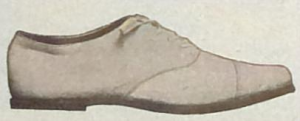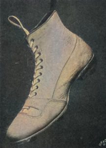 Ja man hat unter diesen eigentlichen Schuhen noch hölzerne Sohlenklappen, die Trippen, beweglich befestigt. Eine Stiege hat man mit solchem Schuhwerk nur von der Seite gehend betreten können. später ließen die Herren, als die Reiterstiefel mit herabfallendem Stulp salonfähig wurden und man den Spitzenbesatz der Unterbeinkleider öffentlich zeigen mußte, diese Canons, diese Spitzen vielmeterweise in den Stulp nähen (heute nennt der Student seinen hohen Stiefel „Kanonen“ und nicht die Spitze, die er überhaupt nur noch in Verbindung mit dem getrunkenen Stiefel kennt). Zur selben Zeit stelzten die Damen auf hohem Höckelschuh einher. Dann wieder wurde der hohe Stiefel durchaus shocking; in durchbrochenen Strümpfen und in Schuhen, deren goldene und silberne Schnallen weitabstehende Bandschleifen hielten, stolzierten Männlein und Weiblein daher. In der Wertherzeit endlich wurde der Stiefel „tiptop“, den heute unsere Reitknechte tragen, und die Damen erschienen in Schuhen mit so wenig Oberleder daß sie mit Kreuzbändern über dem Spann gehalten werden mußten, weil sie sonst wie Pantoffeln geklappert haben würden. Heute sind die Bänder weg das Oberleder ist wieder da und das Kreuz und der Pantoffel – Schluß!