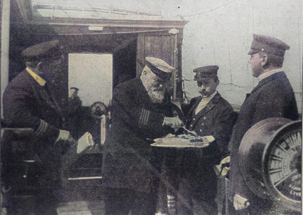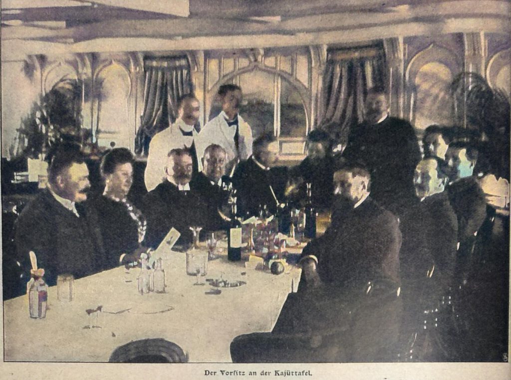 Vom Essen der Zwischendecker erhält der Kapitän täglich eine Kostprobe, das Essen der Kajütpassagiere aber unterzieht er einer erheblich gründlicheren Probe, insofern al an den Mahlzeiten dort, soweit nicht dienstlich verhindert ist, regelmäßig teilnimmt (Abb. obenst.)