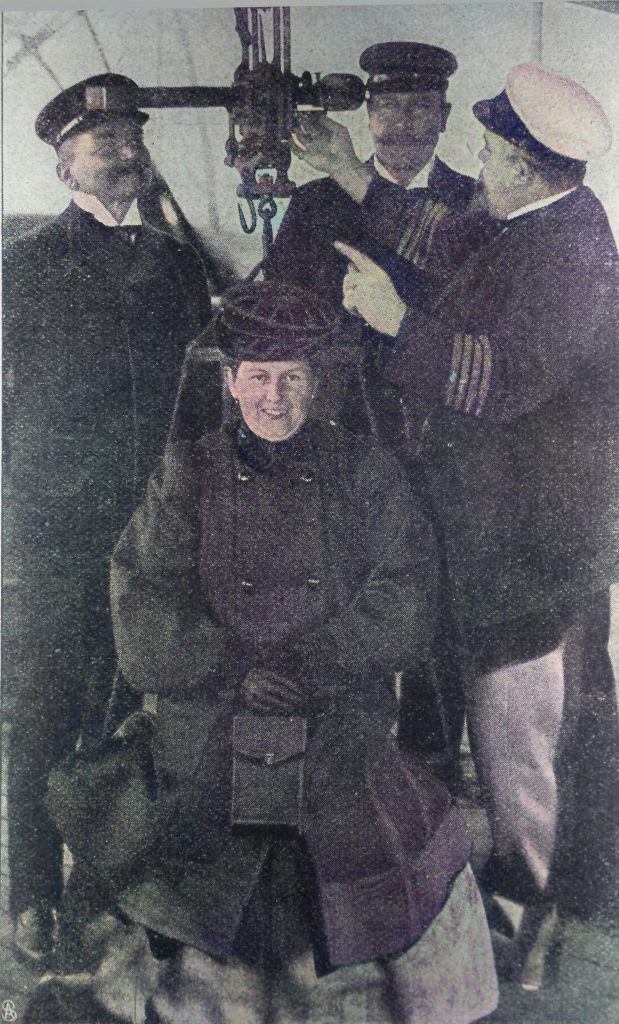 Ganz besondere Aufmerksamkeit und Sorgfalt haben die alleinreisenden Passagiere des weiblichen Geschlechts zu gewärtigen. Mit Argusaugen lässt der Kapitän darüber wachen, daß sie von niemaund in irgendeiner Weise belästigt werden, wie eine Art höchst feuergefährlicher Ladung werden sie mit allerlei – Extravorsichtmaßnahmen umgeben, ja es soll schon manche unter diesen Frauen und Jungfrauen recht herbe Enttäuschung darüber empfunden haben, wie schwer es ihnen unter Umständen gemacht wurde, auf der Reise zu einem ernstlichen und herzstärkenden Flirt zu gelangen.