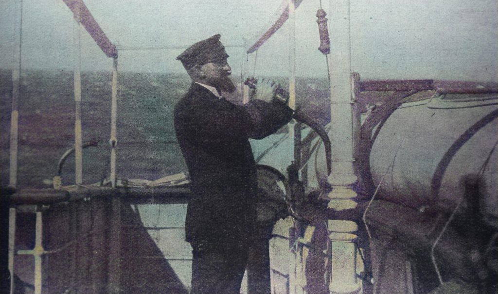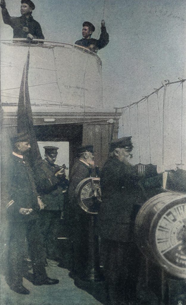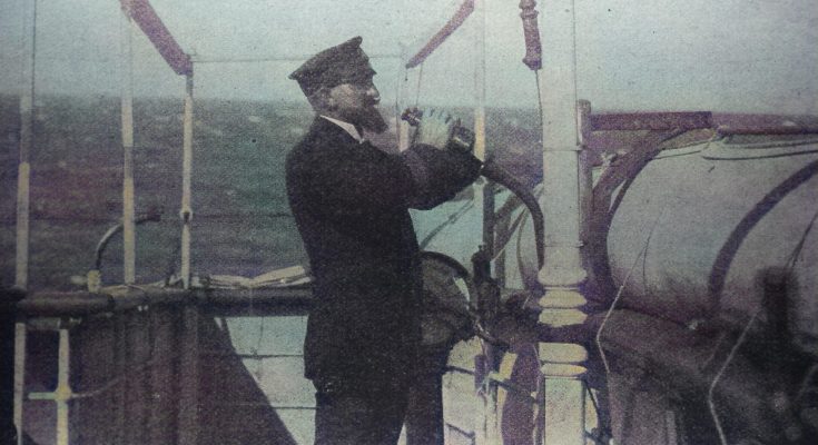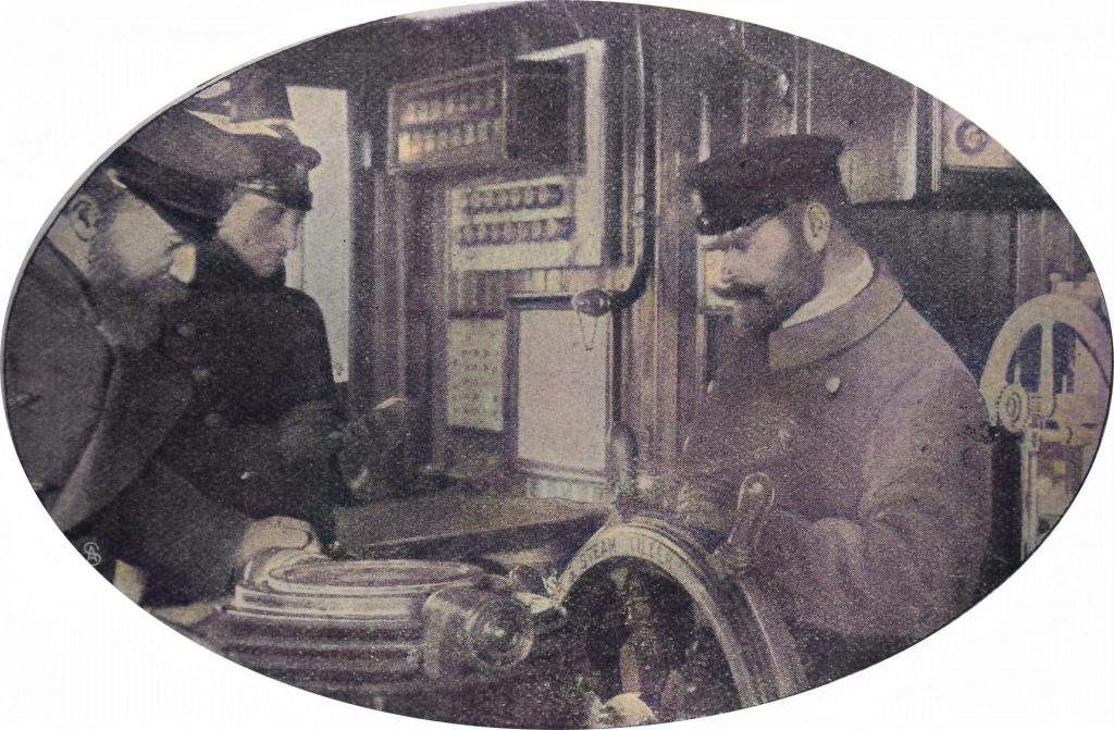 „Land in Sicht!“ läßt der Wachhabende von der Brücke melden (Abb. S. 1035), und schon eilt alles an Deck, um sich das Ansteuern der Küste anzusehen. Nicht lange dauerts so kommt der Lotse an Bord und unterstützt mit seinen Lokalkenntnissen beim Einfahren in den Hafen den Kapitän, ohne daß dieser jedoch dadurch von der Verantwortung für die Sicherheit des Schiffs befreit wird. Dumpf tönt die Dampfpfeife, die Maschinentelegraphen klirren, mächtig erzittert das Schiff unter dem Rückwärtsgang der Schrauben, dann steht es und wird mit Vertolleinen und durch Schlepper auf seinen Platz am Kai gebracht. Alles, was von Bord muß, drängt sich eifrig und besorgt um die Fallreepe, aber doch finden viele noch die Zeit, dem Kapitän noch einmal die Hand zu drücken, und auch unter den übrigen ist wohl selten jemand, der nicht mit Dankbarkeit des Mannes gedenkt, der ihn so sicher und fürsorglich übers Meer geführt hat, und ihm nicht eine weitere glückliche Fortsetzung seiner verantwortlichen Tätigkeit wünscht, die wie kaum eine andere geeignet ist, den Ruf deutscher Tüchtigkeit und Zuverlässigkeit bis in die fernsten Zonen und Länder hinauszutragen.