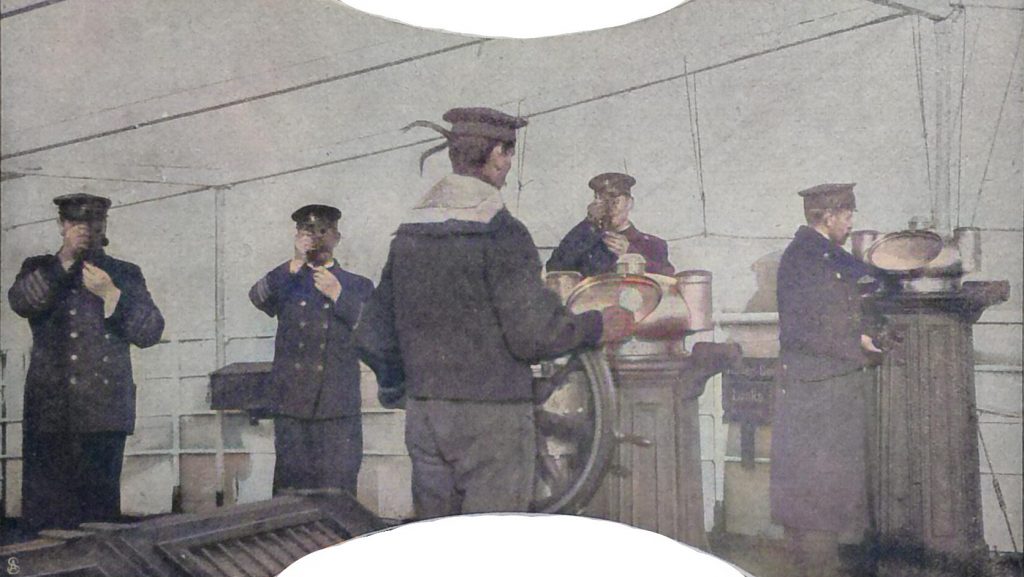 Der Schiffsort wird in der Nähe der Küste, wo der Kapitän bestimmungsgemäß stets selbst auf der Brücke sein soll, nach den sichtbaren Landobjekten, Leuchttürmen, Feuerschiffen, Bojen usw. bestimmt; auf hoher See dagegen ergibt er sich lediglich aus den Beobachtungen der Gestirne, und ein besonders wichtiger Moment ist die Zeit, wo die Schiffsoffiziere mit den Sextanten Aufstellung nehmen, um die Mittagshöhe der Sonne zu messen oder, wie man sagt, sie „zu schießen“, weil die Fernrohre der Meßinstrumente hierbei mit jener Genauigkeit auf die Sonne und den Horizont einvisiert werden, als ob man sie faktisch zur Strecke bringen wollte (siehe Abb. S. 1032).