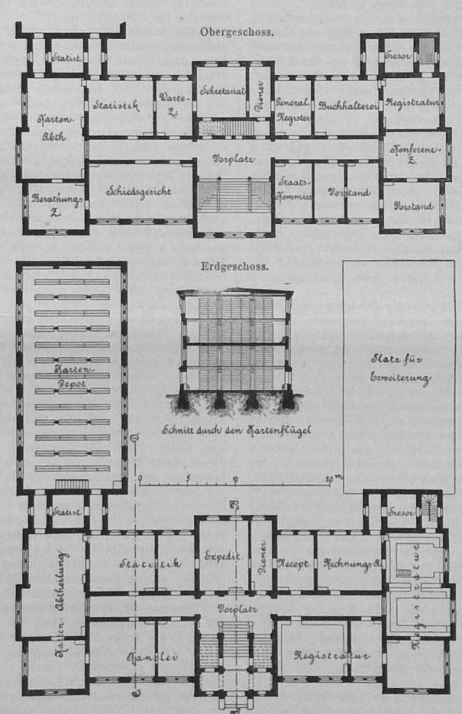 Das Karten-Depot sowie die daran stossenden Arbeitsräume der Karten-Abtheilung sind im April, die übrigen Räume zum 1. Oktober 1893 in Benutzung genommen worden.