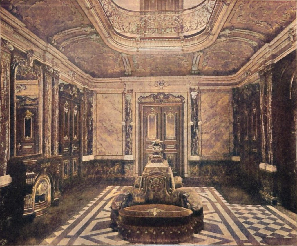 Das Innere ist in den Haupträumen ziemlich reich durchgebildet. Das Vestibül und der Treppenaufgang dazu sind in den Wänden aus Stuckmarmor; ersteres hat eine reich gemalte Glasdecke; die Lichtöffnung im Fussboden des Obergeschosses ist mit einem reichen Schmiedeisernen vergoldeten Gitter umgeben. Die Treppenstufen des Hauseinganges bestehen aus weissem Marmor; das Gewölbe sowie die Vouten unter der Gallerie im Vestibül sind mit flott modellirten Stuckornamenten (an Ort und Stelle angetragen) versehen und als oberer Abschluss der Vestibulwände sind reichere Stuckgesimse mit grosser Hohlkehle bis zur Glasdecke angebracht. Die grosse Hohlkehle ist mit Guirlanden tragenden Engeln auf himmelblauem Grunde bemalt, der Stuck ist entsprechend abgetönt und etwas vergoldet. Zwischen Treppenaufgang und Vestibül ist der Abschluss durch eine schmiedeiserne Glasthür mit tief herunter gehenden Scheiben hergestellt; an der dieser Thür gegenüberliegenden Vestibülwand befindet sich ein Marmor-Kamin mit Spiegelaufsatz. Das Vestibül hat 6 m Breite, 8,25 m Länge und macht in der vorbeschriebenen Ausstattung bei einer Höhe bis. zur Glasdecke von 13,4 m einen prächtigen Eindruck.