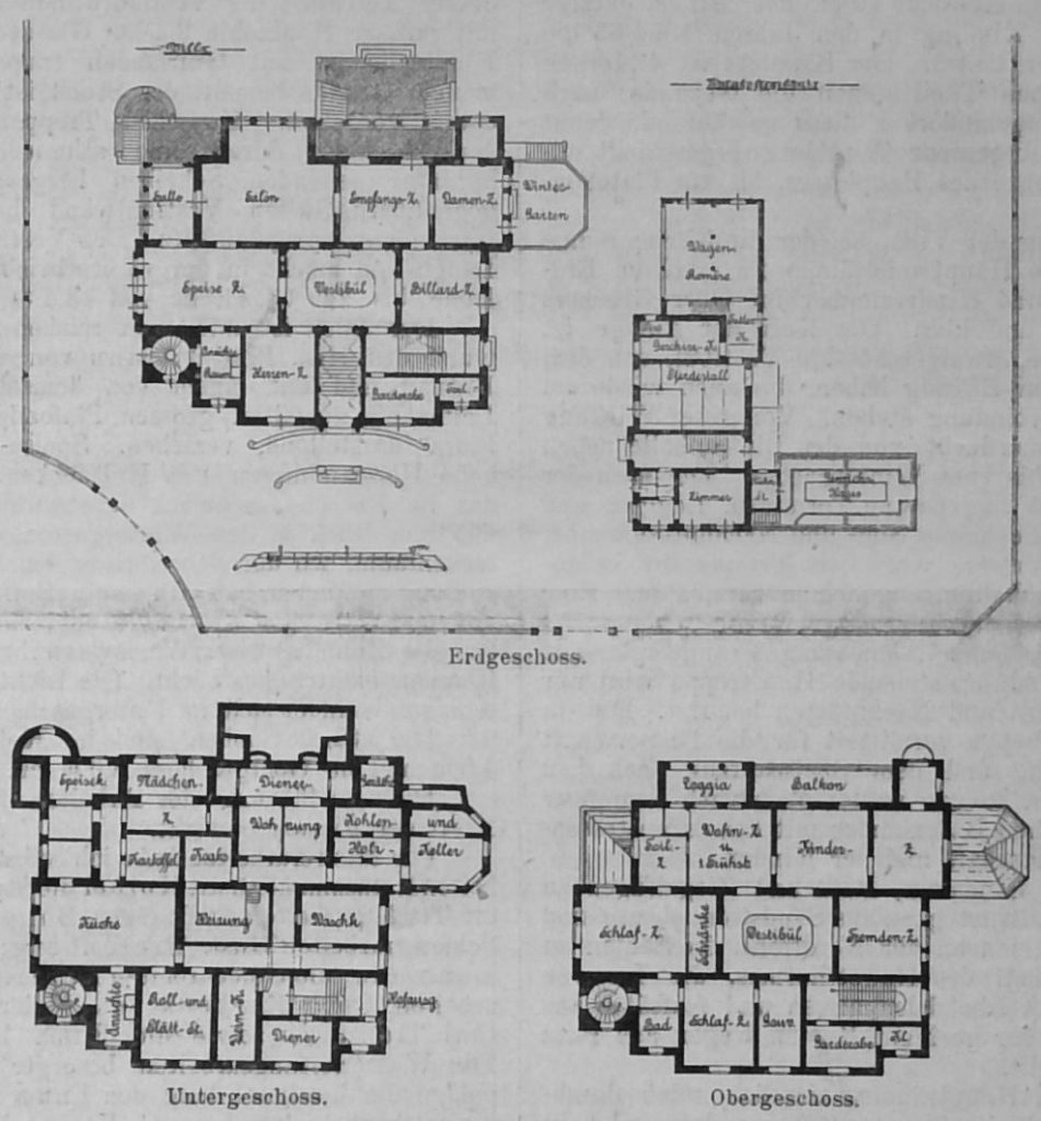 Die Grundrissgestaltung der Villa, bei der die Küchenräume usw. im Sockelgeschoss, die Hauptwohnräume im erhöhten Erdgeschoss und die Schlaf- und Kinderzimmer im Ober-Geschoss angelegt sind, ist einfach und klar. Der Kern der Anlage ist das mit Oberlicht versehene, zweigeschossige Vestibül, von dem fast alle Zimmer unmittelbar Zugang haben, die auch wiederum unter sich in bequemer Verbindung stehen. Von guter Wirkung ist die lange Axe der Zimmerflucht von der Blumenhalle neben dem Speisesaal und Salon bis zum Wintergarten. Die nach der Gartenseite vorgelegten und eingebauten Terrassen, Loggien und Balkons, geschützt gegen die heisse Süd- und Nachmittagssonne, gewähren fast bei jedem Wetter, wenn die Temperatur es gestattet sich im Freien aufzuhalten, angenehme Sitzplätze. Eine Haupttreppe wurde unnöthig durch die Lage der Haupträume im Erdgeschoss; die in bescheidenen Abmessungen angelegte, mit dem Hofausgange in Verbindung stehende Haustreppe wird nur von den Familien-Mitgliedern und Nachtgästen benutzt. Die in den Hauptthurm gelegte Treppe vermittelt für die Dienerschaft den Verkehr von der Küche und dem Speiseaufzug nach dem Anrichte- und Speisezimmer, so wie weiter oben nach dem über dem Anrichteraum befindlichen Badezimmer mit den daranstossenden Schlafzimmern der Herrschaft und der Kinder.