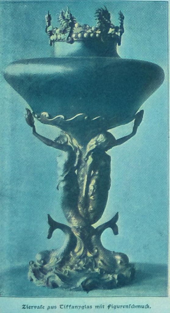 Das Tiffanyglas ist eine der zartesten Erfindungen des modernen Kunstgewerbes, die leichten Glasgebläse, die in allen Farben des Regenbogens schimmern, machen den Eindruck erhärteter Seifenblasen. Es war daher kein leicht zu lösendes künstlerisches Problem, diese zarten luftigen Gebilde mit dem starren festen Metall zu verbinden. Das Tiffanyglas verträgt keinen Zwang, in seiner zufälligen geschwungenen Form lebt es sein eigens künstlerisches Dasein, das frei von jedem Schema ist; gleicht doch fast keines dieser leichten Gebilde, die fast wie kein anderes kunstgewerbliches Produkt den bis ins sensibelste gesteigerten Kunstgeschmack unserer Zeit charakterisieren, dem andern. In jedem Einzelfall mußte daher der Künstler eine andere Fassung ersinnen und sowohl Metall wie die Schmucksteine dem phosphoreszierenden Farbenspiel der Gläser anpassen. In den Prunkstücken, deren Abbildungen wir unsern Lesern vorführen, ist dies in geradezu überraschender Weise gelungen. Leicht und harmonisch schmiegt sich der schmale Goldstreifen um die graziöse Bogenform der Blumenvase. Die Ziervase, deren Farbenspiel den schönsten Muscheln des Meeres gleicht, wird von zwei entzückenden Meerweibchen getragen, und der Rand wird von andern Kindern des Meers von großen Perlen, gebildet. So klingen Darstellung, Form und Farbe harmonisch zusammen.