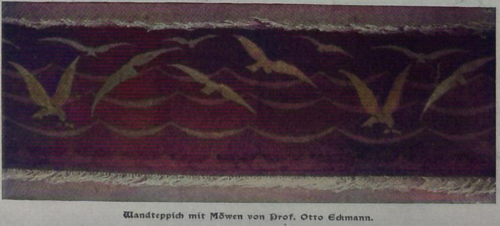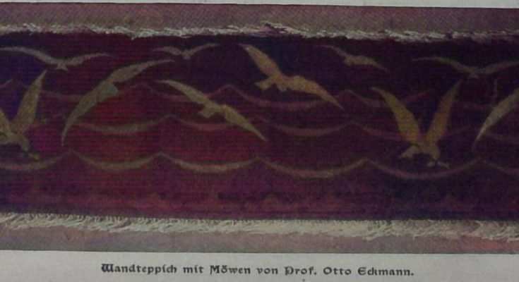 Motive aus dem Tier und Pflanzenleben spielen die Hauptrolle. Mit feinem Takt sind die Vorwürfe aus dem Format und dem Zweck der Webereien komponiert. Schmale Friese, die sich gut zum Wandhintergrund über einem Paneelbrett, über dem Sofa, über dem Klavier eignen, zeigen Wellenkämme, auf denen wallend und wiegend Möwenschwärme sich schaukeln, oder sie gleichen einem blumenbestandenen Uferrand, an dessen Horizont auf schimmernder Strömung helle und dunkle Segel träumend ziehn.
