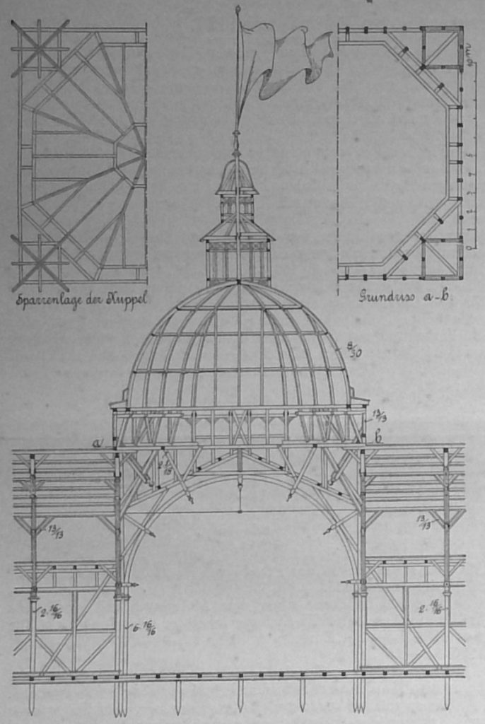 Als Ausstellungsgebiet ist ein etwa 41 Morgen grosses, unregelmässiges Gelände gewählt worden, auf welchem sich Wasser und in einem anderen Theile alter Baumbestand fanden, welche beide den Zwecken der Ausstellung nutzbar gemacht werden konnten, Für die Gestaltung des mit einer Summe von nahezu 60 000 M. errichteten Hanptgebäudes, das einen Flächenraum von etwa 4100 qm bedeckt, war ein augenscheinlich auf Königsberger Architekten beschränkter engerer Wettbewerb ausgeschrieben, aus welchem Hr. Arch. Strehl als Sieger mit einem Entwurf hervorging welcher im Grundriss das bewährte System des ┴-Baues zeigt, dessen äussere Enden durch Gallerien in der Form eines Viertelkreises verbunden sind, sodass dem Besucher eine in sich geschlossene Zirkulation ermöglicht ist. Der Haupteingang führt in eine stattliche Kuppelhalle von 21 m innerer Höhe und 19 m Diagonalspannweite deren Konstruktionssystem wir nebenstehend dieser Besprechung anfügen. Die Kuppel tritt im Aeussern herrschend in die Erscheinung und unterstützt lobhaft die lebendige und in gewissem Sinne festliche Wirkung, die unter Benutzung gleichfalls bewährter Formen zu erreichen versucht ist. Im Innern des Baues ist ein einheitliches Axensystem von 4,5 m durchgeführt worden. Bohlenbinder von 13,5 m Spannweite gestalten ein Mittelschiff, dem 4,5 m breite Seitenschiffe gleich laufen, die zu einzelnen Kojen ausgebildet sind. Die Beleuchtungs-Verhältnisse sind derart geordnet, dass auf 1 qm Grundfläche 0,21 qm Fensterfläche kommen. Die Wandhöhe beträgt in den Seitenschiffen 5 m, im Hauptschiff 9 m.