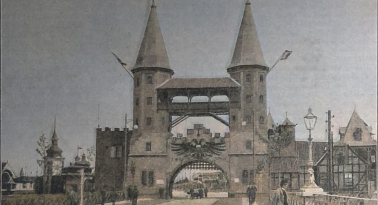 Am Eingange zum Ausstellungsplatze tritt dem Besucher eine Nachbildung des alten, 1572 erbauten und 1851 beseitigten Mühlthores entgegen; das Bauwerk ist eine ausserordentlich sympathisch wirkende Schöpfung des Lübecker Architekten Julius Grube. (Siehe Abbildg. 1). Diesem Hauptthore schliessen sich die Verwaltungsgebäude des Ausstellungs-Ausschusses an.