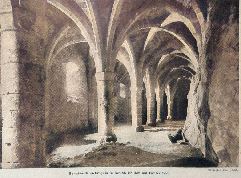 Gelegentlich einer Schweizer Reise kann man zwischen Villeneuve und Montreux, am östlichen Ufer des Genfer Sees ein einstiges Staatsgefängnis kennen lernen. Schloß Chillon, dessen Gewölbe in den Felsen unter dem Seespiegel eingehauen sind, beherbergte einst unter anderen angesehenen Gefangenen auch den Genfer Staatsmann Francois von Bonnivard, der dort auf Veranlassung Herzog Philiberts von Savoyen seiner freiheitlichen Bestrebungen wegen interniert wurde. Vier Jahre lang, von 1532 bis 1536, schmachtete er, an einen eisernen Ring gekettet, in einem der unterirdischen Gewölbe (Abbildung), bis endlich ihm und seinen Leidensgenossen durch die Berner, als Befreier Genfs, Rettung und Erlösung wurde. Durch Byrons berühmtes Gedicht: „The Prisoner of Chillon“ ist Bonnivards Name dauernd verherrlicht worden.