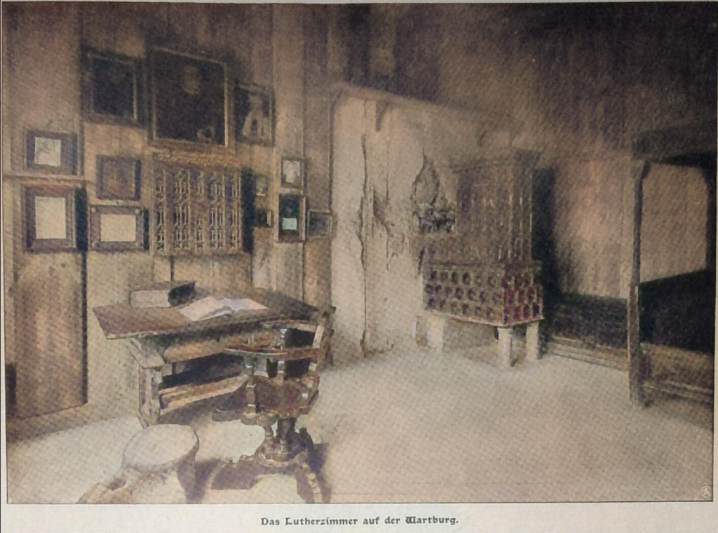Von aller Spekulationswut unberührt und voraussichtlich für alle Zeiten unberührt bleibend, wirkt in seinem stillen Zauber das Lutherzimmer auf der Wartburg (Abbildung), das sich unverändert erhalten, wie es einst gewesen, als der große Reformator darin vom Mai 1521 bis März 1522 gehaust und sich dort mit der Uebersetzung des Neuen Testaments befaßte. Anstoßend an dieses Stübchen, dessen von dem Führer versicherten unberührter Zustand so manche der Touristen derart wörtlich nehmen, daß sie nach Tintenflecken Umschau halten, die er etwa bei der Kenntnisnahme der kaiserlichen Achterklärung aus gespritzt haben mochte, liegen die sogenannten Reformationszimmer, drei Räume, die im Jahr 1872 neu instand gesetzt und mit verschiedenen Gemälden von Pawels und Thumann ausgeschmückt wurden.