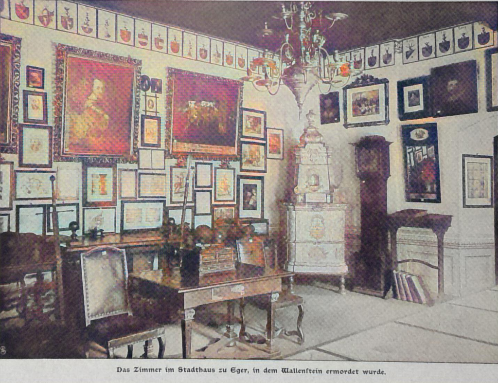 In pietätvollster Weise hat dieses Festhalten alter denkwürdiger Erinnerungen auch die böhmische Stadt Eger angestrebt und dadurch dem ruhmreichen Wallenstein ein Denkmal geschaffen, das die trockene, tote Chronik seiner Taten, seines Lebens und seines Sterbens illustriert. Im Stadthause zu Eger, dem früheren Kommandantenhause, in dem er am 25. Februar 1634 meuchlings ermordet wurde, hat man 1872 ein Museum gegründet, das eine reiche Sammlung von persönlichen Erinnerungen an den tapferen Generalissimus und seine Zeit enthält.