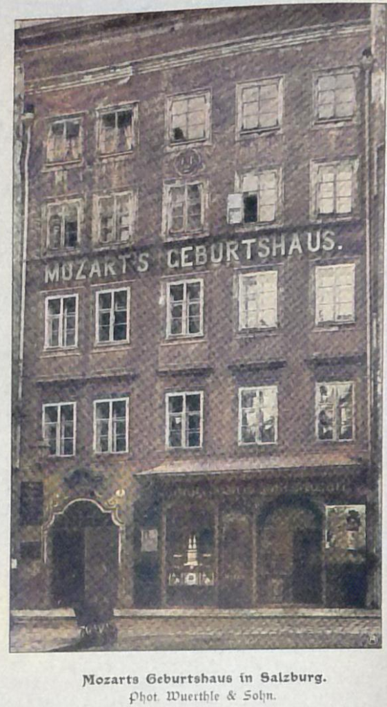 Oesterreich, das an Kunstschätzen und landschaftlichen Reizen so reiche Land, beging in diesen Tagen ein Fest, das unsere Aufmerksamkeit auf eine Sehenswürdigkeit Salzburgs lenkt, das Ziel vieler Mozartverehrer. Es ist Mozarts Geburtshaus (Abbildung), dem anläßlich der dort soeben veranstalteten Musikfestspiele das Interesse aller Freunde der unsterblichen Muse des Meisters doppelt gehört. Das alte vierstöckige Gebäude in der Getreidegasse, in dessen Parterreräumen ein dem Zug der Zeit folgender Drogist seine Pyramiden von Lackfarben und Lichten und Anpreisungen von Kognakfabriken wertvoller zu machen glaubte, indem er seinen Laden „Zum Mozart“ benannte, beherbergt auch das Mozartarchiv, das sich in diesen Tagen eines lebhafteren Interesses zu erfreuen hatte, als es sonst von reisenden Amerikanern dem Residenzschloß des Großherzogs von Toskana zuteil wurde.