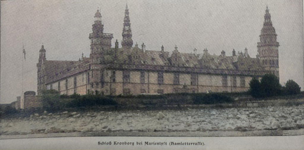 Wohl keiner der Vergnügungsreisenden, die von Rügen aus oder, den kürzeren Seeweg vorziehend, über Warnemünde – Gjedser einen Ausflug nach Dänemark unternahmen, hat es verabsäumt, nachdem er Kopenhagen und seiner schönen Umgebung einen Besuch abgestattet, auch das bei Marienlyst gelegene Schloß Kronborg (Abbildung) aufzusuchen. Zwar ist Kronborg durch Fredensborg, das seit Jahrzehnten als bevorzugter Sommeraufenthalt der dänischen Königsfamilie und ihrer zahlreichen russischen und englischen nahen Verwandten dient, „außer Kurs“ gesetzt, aber die Touristen lieben es und verabsäumen nicht, auf die nahe bei Marienlyst befindliche Terrasse zu pilgern, auf der dem Hamlet von Shakespeares Gnaden der Geist seines Vaters erschienen sein soll. Es ist für sie eine schaurig· schöne Empfindung, die durch den Gedanken nicht beeinträchtigt wird, daß Schloß Marienlyst einer Aktiengesellschaft verkauft wurde, die vielleicht dereinst eine erhöhte Kurtaxe für die Verpflichtung in Anschlag bringen wird, ihren Gästen den geharnischten Geist zweimal wöchentlich zu mitternächtiger Stunde vor zuführen.