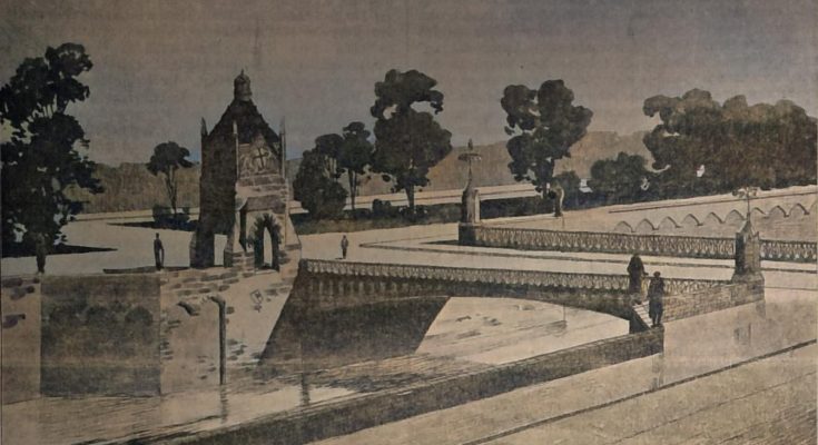 Dieses Profil war für die Erzielung gefälliger Lösungen allerdings erschwerend, weil im Verhältniss zur Spannweite nur geringe Höhenunterschiede zwischen der Oberkante des vorgeschriebenen Lichtraums und der Strassenhöhe zur Verfügung standen, wie die mit dem ersten und dem zweiten Preis ausgezeichneten Entwürfe für die Kaiserstrassenbrücke erkennen lassen (s. Abbildg. 1 & 2). Für die anderen Brücken und Stege liegen die Verhältnisse ähnlich.