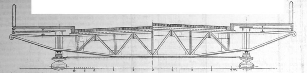 Die Maschinenbau-Aktien-Gesellsch. Nürnberg hat die Gehwege auf je 2 Hauptträgern, die Fahrbahn auf 4 Hauptträgern aufgelagert und Fahr- und Fussweg inbezug auf senkrechte Beanspruchungen vollständig unabhängig von einander gemacht, wodurch die Erschütterungen der Fahrbahn auf den Fusswegen nicht empfunden werden. Die vom Fussweg aufgenommenen Windkräfte werden auf die Fahrbahn durch Stäbe in der Höhe des Belages, die in senkrechter Richtung nachgiebig angeordnet sind, übertragen.