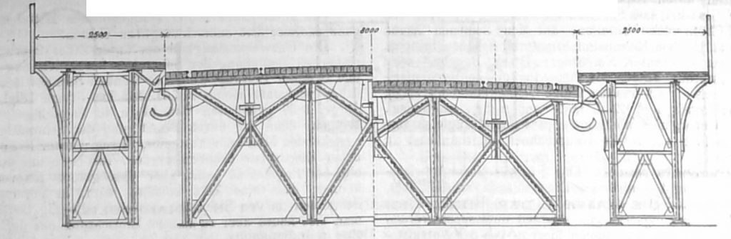 Hr. Ob.-Ing. Kübler hat in seinem Entwurf 2 Hauptträger für die Brücken angenommen und mit Rücksicht auf deren schiefe Stellung zum Flusslauf die Querträger an den Knotenpunkten der Hauptträger auf Kugelflächenlagern aufgelagert.
