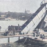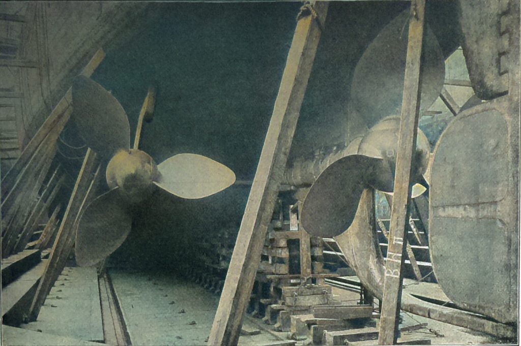 Das zeigt den „Fürst Bismarck“ bei seiner ersten Dockung, bei der die Schraubenflügel an die Naben der Wellen angesetzt worden sind.