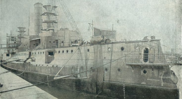 Ehe die Aufbauten und Brücken errichtet werden, in der Weise, wie es die Bilder zeigen, werden die Maschinen und die Kessel durch die großen Kräne der Werft in das Schiff eingesetzt. Die Decks werden dann zugelegt und Schornsteine und Gefechtsmasten oder die Gefechtstürme ebenfalls mit Kranhilfe, wie sie das Bild veranschaulicht, in das Schiff gebracht.