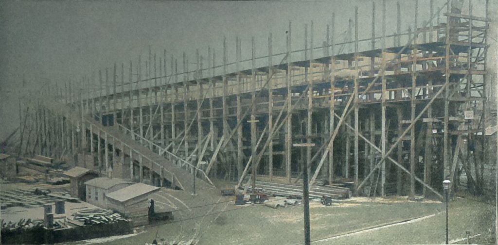 Auf dem Helgen sind inzwischen die Stapelklötze errichtet worden, auf denen das Schiff gebaut wird. Ein Holzgerüst in der Form der breitesten Wasserlinie ist errichtet worden, um Platten, Winkel und Stahlstücke an die Stelle zu heben, wo ihr Einbau stattfinden soll. Diese Arbeiten zur Herstellung der Zeichnungen, die Schnürbodenarbeiten, die Arbeiten am Blockmodell, die Materialbeschaffungen, die Herrichtung des Helling und die ersten Arbeiten in den einzelnen Werkstätten sind die vorbereitenden Arbeiten für den eigentlichen Bau selbst, der mit der Streckung des Kiels beginnt.