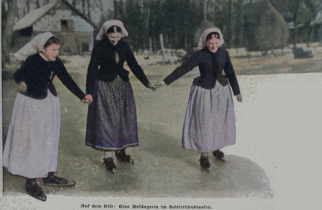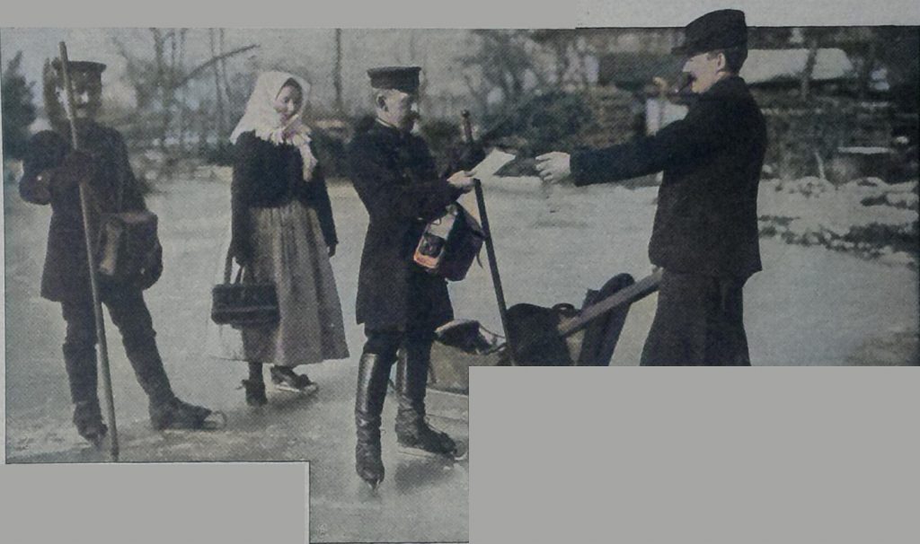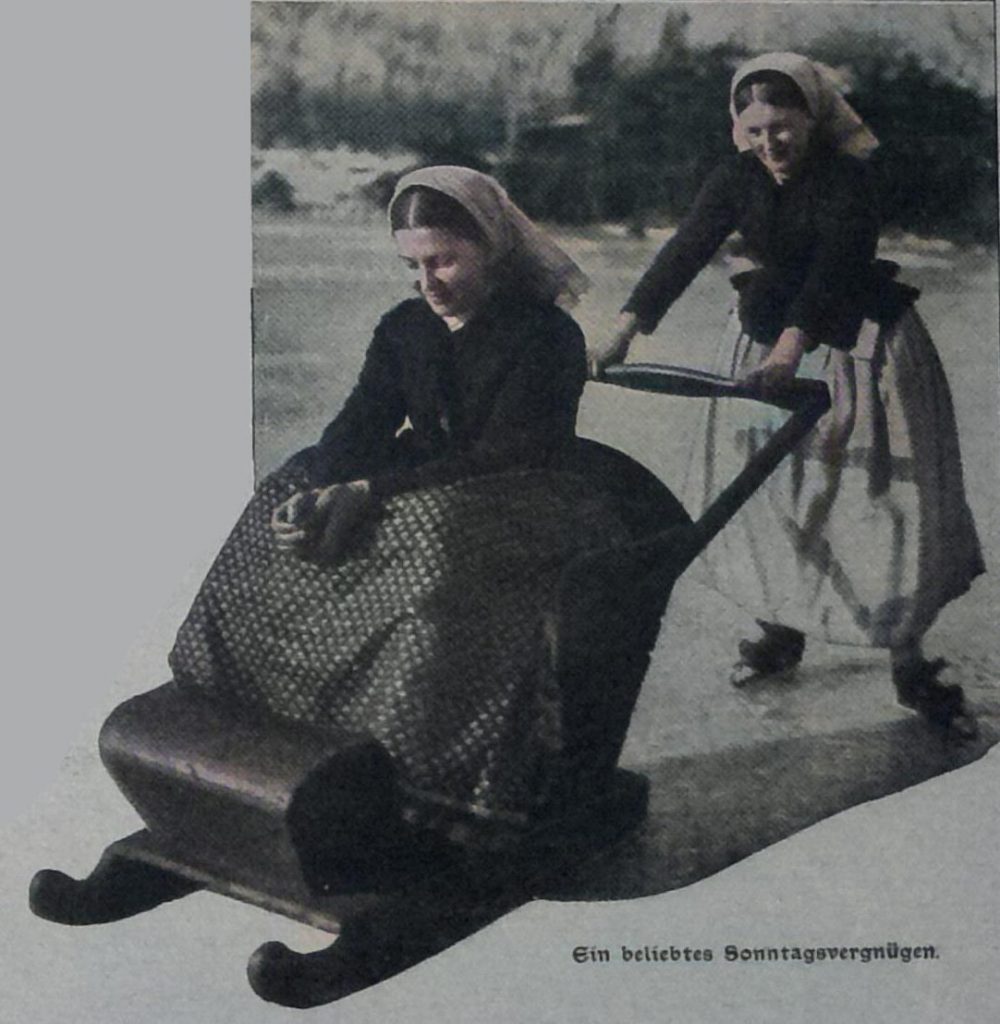 Hier trifft man den Postboten bei der Ausübung seiner Berufspflichten auf dem Stahlschuh, dort gleitet der Geistlich auf „Holländern“ auf dem Weg Kirche hin, führt der Bauer seine Erzeugnisse zu Markt, bringen der Milchhändler, der Metzger und der Bäcker ihre Ware den Kunden ins Haus und auf Schlittschuhen eilt die schmucke Bauerstochter in ihrer kleidsamen Tracht den Freuden eines Kaffeeklatsches entgegen.