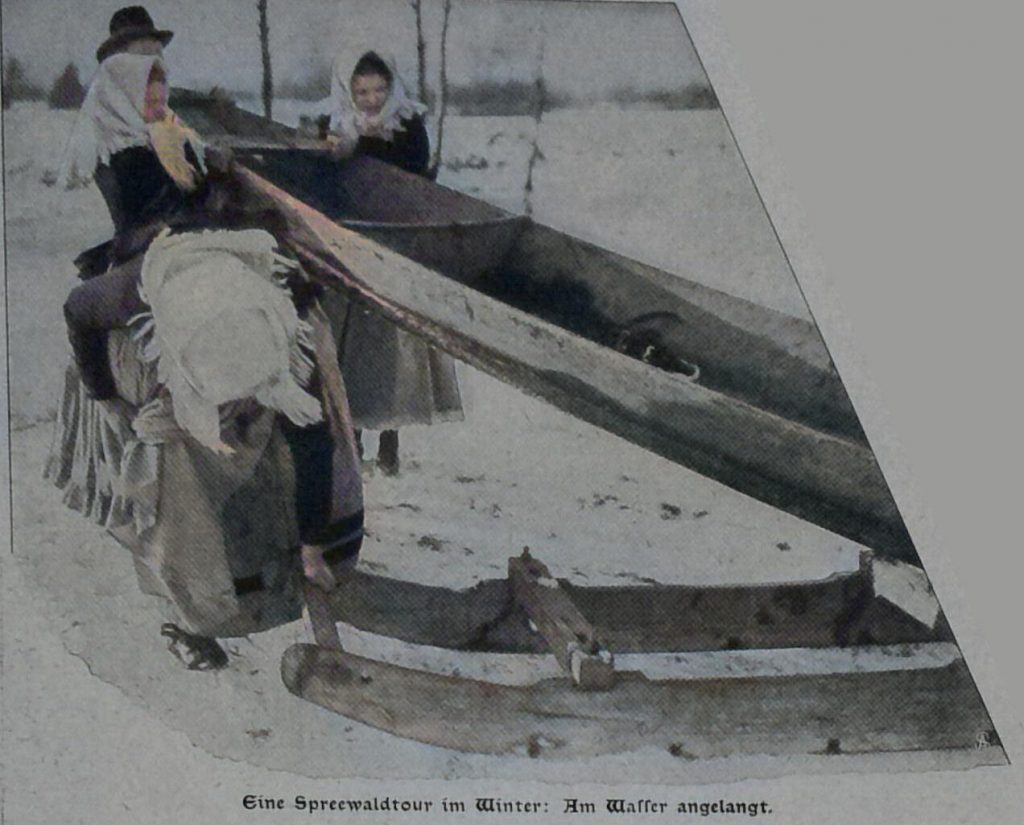 Uns interessiert hier vor allem der Spreewald im Winter wahrend der Eis- und Schneeperiode, wenn diese fast endlose Wasserfläche sich mit einer starken Eiskruste bedeckt. Kahn und Ruder sind beiseite geschafft worden, und an ihre Stelle trete Schlittschuhe und Eisstuhl. Jung und alt bedienen sich dieser Fortbewegungsmittel mit eine Geschicklichkeit, die ihnen angeboren zu sein scheint.