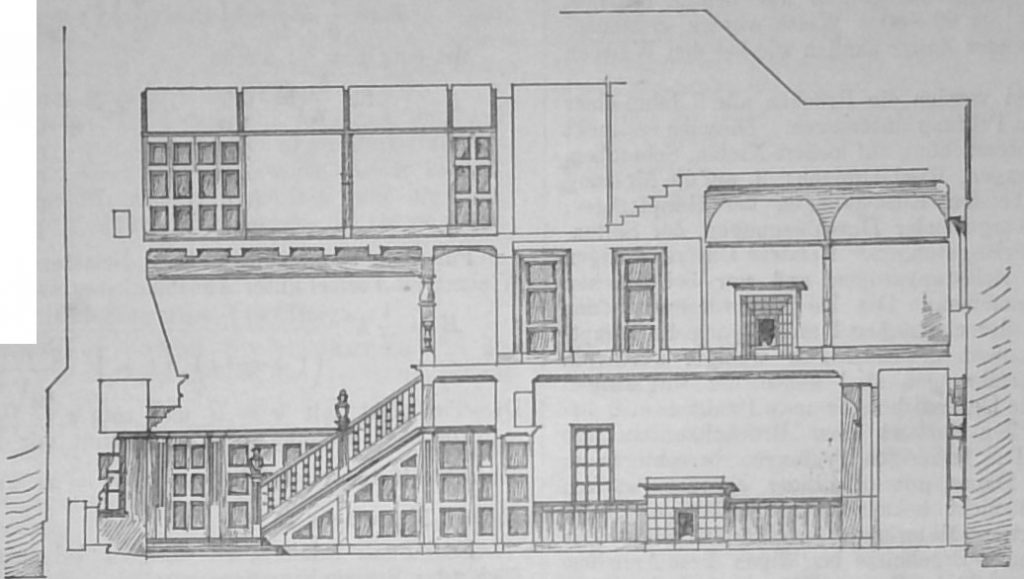 Die hohen Wände der Halle und die durch eine kleine Luke für sich beleuchtete Gallerie über dem Windfang sollen zur Aufnahme der vom Bauherrn auf seinen Reisen gesammelten Felle, Waffen und Schmucksachen dienen.