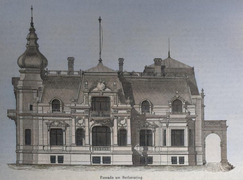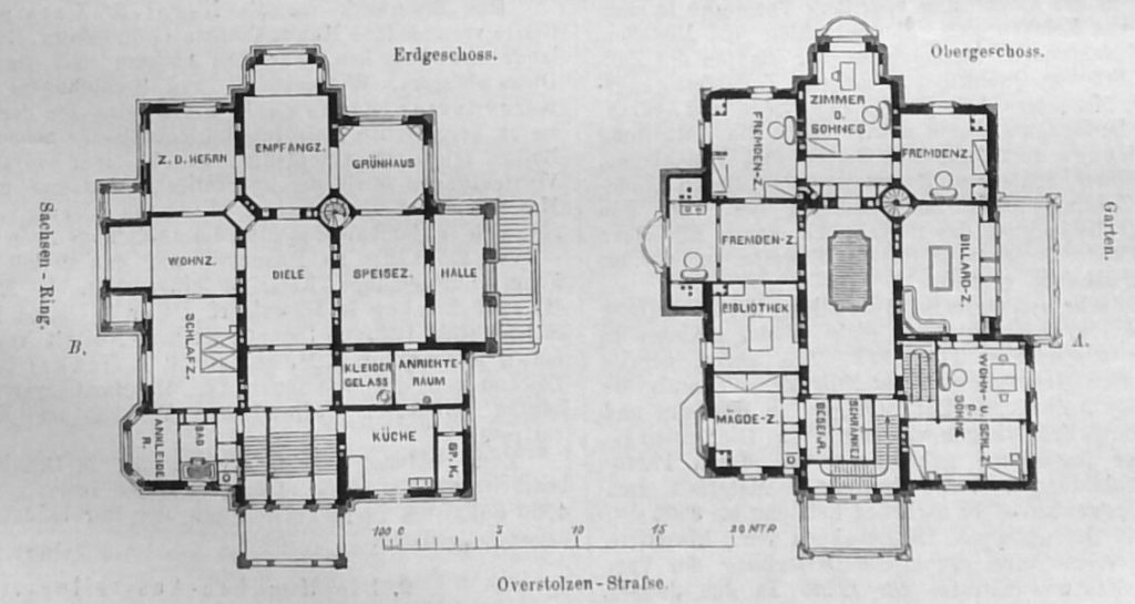 Ueber die Einzelheiten der Lösung geben die Abbildungen in der Hauptsache genügende Auskunft. Das mit seiner Vorderseite nach NO. gerichtete Haus steht durch einen Vorgarten-Streifen vom Sachsenring und durch einen Hof mit den Stallgebäuden von der Overstolzen-Strasse getrennt – frei inmitten des durch ein reiches schmiedeisernes Gitter abgeschlossenen Grundstücks, dessen hinterer Theil als Garten ausgebildet ist.