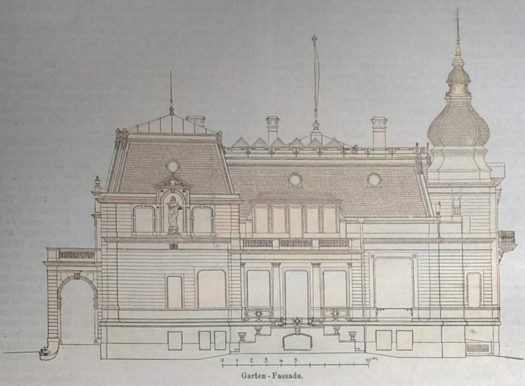 In dem vorliegenden Falle lag ausserdem der bestimmte Wunsch des Bauherrn vor, sämmtliche für ihn selbst erforderliche Räume in einem 2,5 m über Erdgleiche befindlichen Erdgeschoss angeordnet zu sehen. Zur Unterbringung der Zimmer für die Söhne, für Besuch, für das Billard, eine kleine Bibliothek usw., von denen eine nicht unbeträchtliche Zahl vorgeschrieben war, empfahl sich unter den vorliegenden Umständen am meisten die Wahl eines hohen Mansard-Daches, das einerseits dem Hause die ausdrücklich gewünschte Erscheinung eines eingeschossigen Baues beliefs, andererseits sich gegen die bedeutenderen Höhenabmessungen nachbarlicher Gebäude geltend zu machen vermochte.
