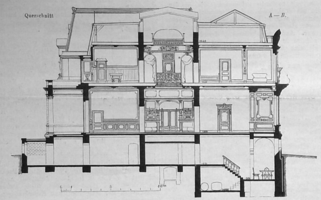 Das bezeichnende Moment der Grundriss-Gestaltung ist die Anordnung einer mittleren, durch Oberlicht beleuchteten „Diele“, welche als Zimmer ausgestattet und benutzt – in beiden Geschossen sowohl den Schlüssel wie die Verbindung sämmtlicher übrigen Zimmer abgiebt.