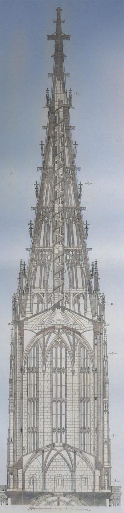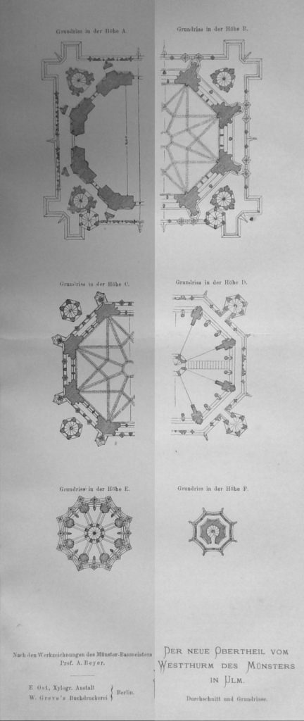 Und niemals ist einem Baumeister mit grösserem Rechte gehuldigt worden. Denn steht Beyer in Demjenigen, was er an diesem Werke künstlerisch geleistet hat, auch auf den Schultern der grossen mittelalterlichen Meister Ulrich Ensinger und Matthaeus Böblinger, deren kühne Gedanken er zu verwirklichen strebte, und darf neben seiner eigenen Thätigkeit auch diejenige seiner unmittelbaren Vorgänger Thrän und Scheu, sowie des ausgezeichneten Münster-Beiraths, seines Lehrers Josef von Egle nicht vergessen werden, so gehörten die Aufgaben, welche ihm künstlerisch und technisch gestellt waren, doch zu den schwierigsten und verantwortungsvollsten, die auf diesem Gebiete überbaupt gelöst werden können. Die Art und Weise aber, wie er sie in ruhigem Schaffen, gleichsam mit spielender Sicherheit innerhalb eines Zeitraums von nur 9 Jahren zu lösen gewusst hat, sichert ihm Anspruch auf unvergänglichen Ruhm bei der Nachwelt und auf die dankbarste Anerkennung seiner Zeitgenossen. Aus dem Herzen aller Angehörigen des deutschen Baufachs bringen wir ihm darum unsern innigsten und wärmsten Glückwunsch entgegen! Zu einer eingehenden Würdigung des Werkes selbst ist heute nicht Zeit. Sie wird den Lesern des Deutschen Bauzeitung deren Aufmerksamkeit ja wiederholt schon auf das Ulmer Münster gelenkt worden ist, später von berufener Seite geliefert werden. Mögen die Darstellungen des Durchschnittes durch den neuen Thurmtheil mit den zugehörigen Grundrissen desselben, die wir auf einem besonderen Blatte beifügen, unsere früheren Mittheilungen einstweilen ergänzen und zugleich die Abweichungen erkennen lassen, welche der Münster-Baumeister im Laufe der Ausführung gegen seinen ersten Riss (Jahrg. 84 No. 44 d. Bl.) beliebt hat. Dieselben sind durchweg im Sinne einer grösseren Annäherung an den vorhandenen alten Thurmriss des Matthaeus Böblinger getroffen, wenn auch die grössere Gesammthöhe (161 m gegen 151 m) und die Steigerung der Höhe des Thurmhelms (59 m) gegenüber derjenigen des Achtecks (32 m) beibehalten und als oberer Abschluss des Helms statt der von Böblinger geplanten Marienstatue eine Kreuzblume gewählt ist. Da letztere erst am 31. Mai versetzt worden ist, so hat das Gerüst vorläufig nur bis zur kleineren Hälfte des Helms entfernt werden können und es wird immerhin noch einige Zeit dauern, bis der letztere sich unverhüllt den Blicken darstellen wird. Wie der Ulmer Münsterthurm nunmehr der höchste aller vorhandenen Kirchthürme ist, so darf er – mit und neben dem St. Stephansthurme in Wien – auch als der schönste unter ihnen betrachtet werden. Ein kostbares Besitzthum des deutschen Volkes, auf welches stolz zu sein, dieses alle Ursache hat.